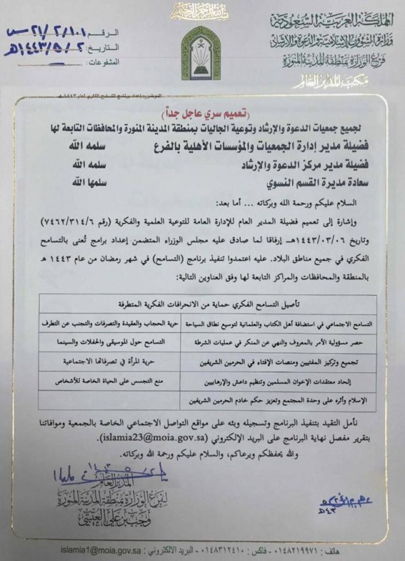 وكان عدد من مرتادي مواقع التواصل الاجتماعي تداولوا خطاباً موجهاً لعدد من الجهات (جمعيات الدعوة والإرشاد وتوعية الجاليات بمنطقة المدينة المنورة والمحافظات التابعة لها، ولمدير إدارة الجمعيات والمؤسسات الأهلية بالفرع ومدير مركز الدعوة والإرشاد، ومديرة القسم النسوي).