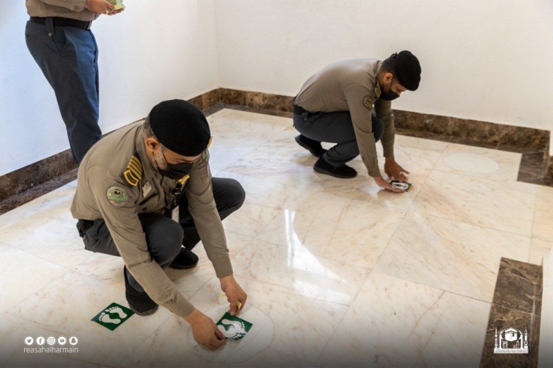 «شؤون الحرمين» تبدأ في وضع ملصقات التباعد في المرافق الخارجية