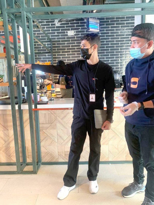 مراقبان من أمانة منطقة عسير يقفان على محل تجاري للتأكد من الإجراءات الاحترازية والتدابير الوقائية الخاصة بكورونا. (أمانة عسير)
