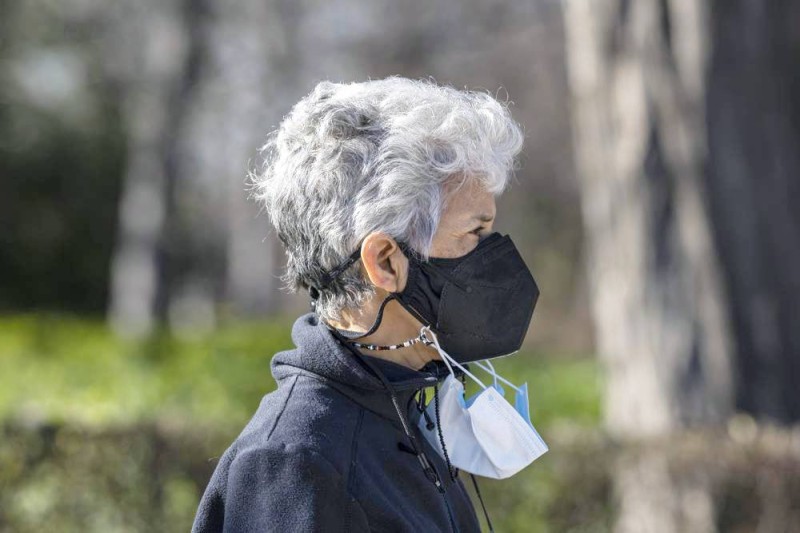 إسبانية ترتدي أكثر من كمامة في حديقة بمدريد. (وكالات)