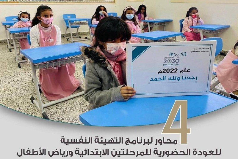 بدأت إدارات التعليم بمناطق ومحافظات السعودية تنفيذ برنامج التهيئة للعودة الحضورية الآمنة للمرحلتين الابتدائية ورياض الأطفال في 23 يناير الجاري، مشتملاً على أربعة محاور رئيسية تتضمن: طمأنة الطلبة وأسرهم بسلامة وأهمية العودة الحضورية، وتعزيز السلوك الإيجابي بتطبيق الإجراءات الاحترازية في المدرسة، وزيادة دافعية الطلبة للتفاعل مع الأنشطة التعليمية، إضافة إلى تفعيل التواصل مع الأسر وأولياء الأمور والإجابة عن تساؤلاتهم واستفساراتهم.
