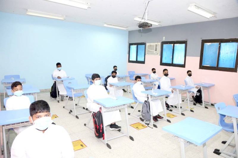 احترازات صحية وتباعد وكمامة في الفصول الدراسية.