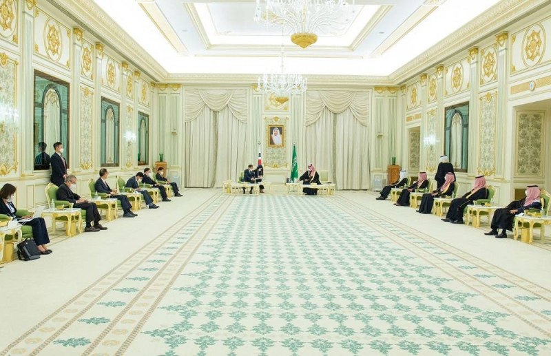 حضر جلسة المباحثات، وزير الطاقة الأمير عبدالعزيز بن سلمان بن عبدالعزيز، ووزير الداخلية الأمير عبدالعزيز بن سعود بن نايف بن عبدالعزيز، ووزير الحرس الوطني الأمير عبدالله بن بندر بن عبدالعزيز، ونائب وزير الدفاع الأمير خالد بن سلمان بن عبدالعزيز، ووزير الخارجية الأمير فيصل بن فرحان بن عبدالله، ووزير الدولة عضو مجلس الوزراء مستشار الأمن الوطني الدكتور مساعد بن محمد العيبان، ووزير التجارة وزير الإعلام المكلف الدكتور ماجد بن عبدالله القصبي، ووزير الاستثمار المهندس خالد بن عبدالعزيز الفالح (الوزير المرافق)، ووزير الاقتصاد والتخطيط فيصل بن فاضل الإبراهيم، وسفير خادم الحرمين الشريفين لدى كوريا سامي السدحان.