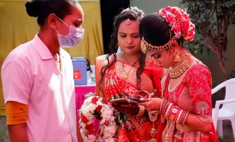عروس تعرض شهادة التطعيم في هاتفها للمرضة في قاعة فرحها. (وكالات)
