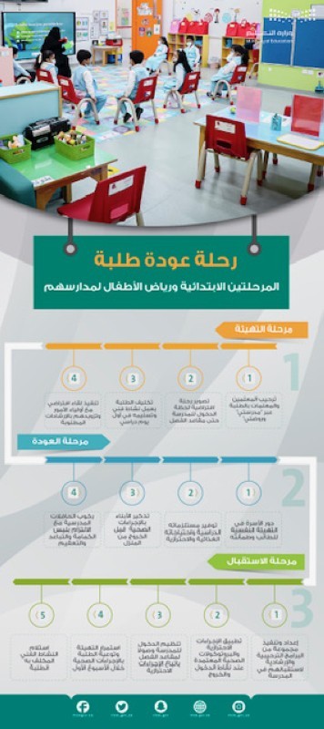 وتبدأ رحلة عودة الطلاب والطالبات إلى مدارسهم بتطبيق برنامج التهيئة للعودة الحضورية، الذي بدأ بترحيب المعلمين والمعلمات بطلابهم عبر منصتي «مدرستي» و«روضتي»، ومحاكاة أول يوم دراسي من خلال تصوير رحلة افتراضية من لحظة دخول الطلبة للمدرسة حتى وصولهم إلى مقاعد الفصل الدراسي، وكذلك تنفيذ لقاء افتراضي مع الأسر وأولياء الأمور لتزويدهم بالإرشادات المطلوبة التي تدعم التحصيل الدراسي والمحافظة على صحة أبنائهم، إضافة إلى تكليف المعلم لطلابه بعمل نشاط فني وتجهيزه لتسليمه في اليوم الأول.