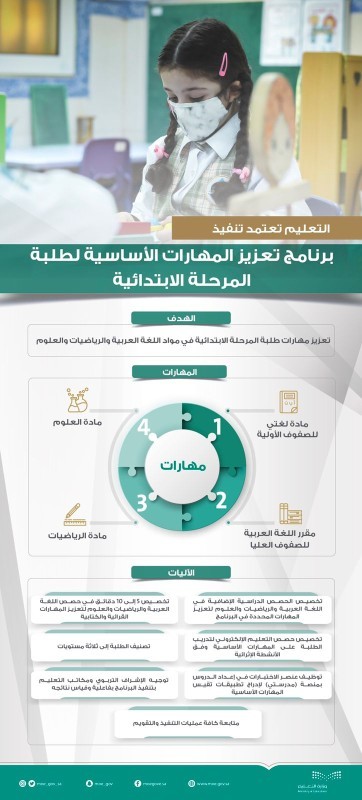 اعتمدت وزارة التعليم تنفيذ برنامج تعزيز المهارات الأساسية لطلاب وطالبات المرحلة الابتدائية؛ انطلاقاً من أهمية تعزيز مهارات الطلبة في مواد اللغة العربية والرياضيات والعلوم، وذلك بعد استئناف الدراسة الحضورية لطلاب وطالبات المرحلتين الابتدائية ورياض الأطفال مطلع الأسبوع الحالي.