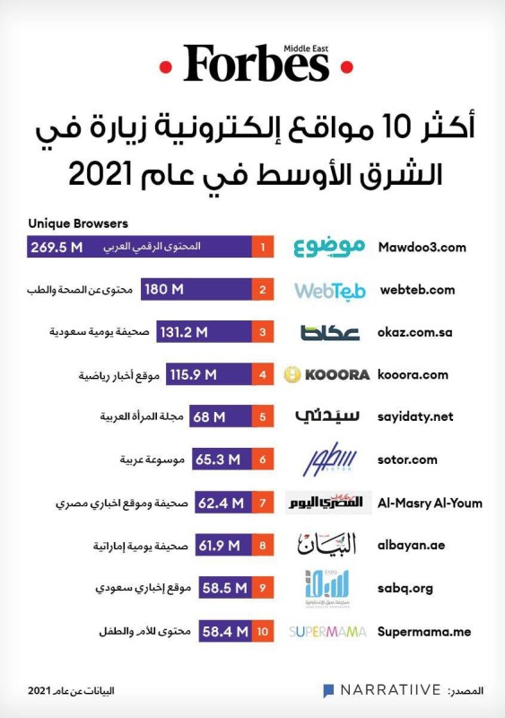 وتنشر مجلة «فوربس الشرق الأوسط» كل شهر قوائم وتصنيفات ذات صلة بالمنطقة بناءً على بحث علمي، وتقدم رؤى وتعليقات وتحليلات حول الأشخاص والشركات والصناعات التي تشكل الاقتصادات في العالم العربي.