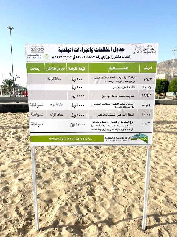 وشرعت الأمانة في وضع لوحات تعريفية في الحدائق العامة بمكة المكرمة توضح نوعية هذه المخالفات والغرامات المالية المترتبة عليها.