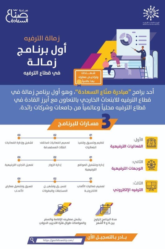 ضمن برامجها لمبادرة صُنَاع السعادة أطلقت الهيئة العامة للترفيه أول برنامج زمالة في القطاع الترفيهي بالمملكة العربية السعودية بثلاثة مسارات، من خلال ابتعاث عدد من المتدربين خارجيا لجامعات عالمية، وشركات رائدة، والتعاون مع أبرز القادة المحليين والعالميين للارتقاء بخدمات القطاع، ورفع مستوياته لأفضل المعايير العالمية الحديثة.