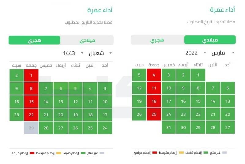 وأظهرت صفحة حجوزات تصاريح العمرة في تطبيقي «اعتمرنا» و«توكلنا» لشهر مارس، أن مؤشر السعة المحجوزة باللون الأخضر «خفيف» في كافة أيام الشهر ما يعني إمكانية أداء العمرة بكل يسر، باستثناء أيام الجمعة من كل أسبوع التي جاءت باللون الأحمر «ازدحام مرتفع» في ظل إمكانية إتاحة الحجز فيها، فيما دعت وزارة الحج والعمرة إلى اختيار التاريخ والوقت المناسبين، مشيرة إلى أنه يمكن للمستفيدين أو المرافقين اختيار الوقت المناسب وتجنب أوقات الذروة.