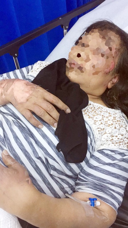 اطلعت «عكاظ» على حالة الزوجة المحروقة، إذ تعرضت من زوجها لحرق بالبنزين على وجهها وأجزاء من جسدها تسبب في تشوهها. وكانت جمعية حماية الأسرة باشرت الحالة حيث أفادت الجمعية أن الزوجة الضحية متزوجة من مواطن منذ 25 عاما وأنجبت له طفلين، وقالت الأم في شكواها الأولية أن زوجها غير سوي وسلوكه غير جيد واضطرت إلى طلب فسخ نكاحها منه بسبب سوء عشرته، وقدمت دعوى أمام محكمة الأحوال الشخصية، كما قدمت لاحقا دعوى جنائية ذكرت فيها أن زوجها حاول قتلها بسكب مادة البنزين عليها وإشعال النار فيها ما تسبب لها في حروق من الدرجة الثانية في الوجه وفروة الرأس والعين والظهر واليدين وتقرر علاجها في وحدة الحروق تحت العلاج والملاحظة الطبية، واطلعت «عكاظ» على تقرير طبي يفيد أن الزوج يعاني من اكتئاب نفسي مزمن لكنه واع ومدرك ولا يعاني من أعراض نشطة للمرض العقلي.