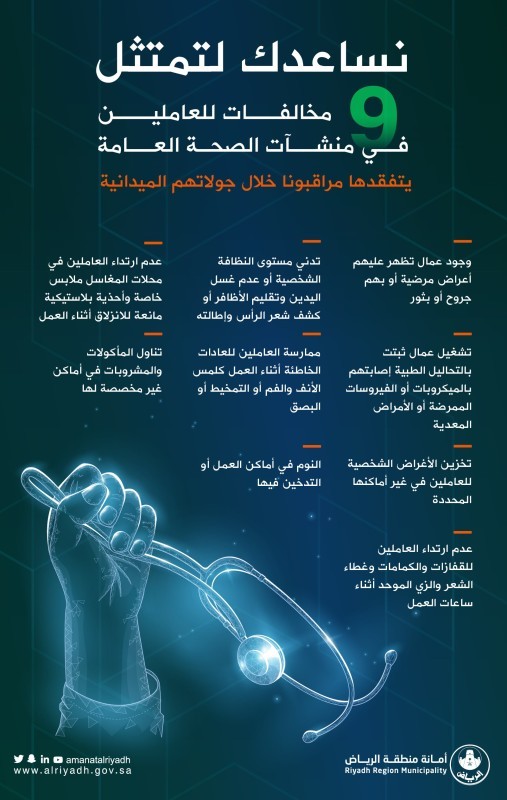كشفت أمانة منطقة الرياض أبرز 9 مخالفات يرصدها مراقبوها أثناء زياراتهم الرقابية على العاملين في منشآت الصحة العامة ضمن نطاق العاصمة، بهدف توفير بيئة صحية في المحل التجارية، ومنع انتقال الأمراض المعدية.