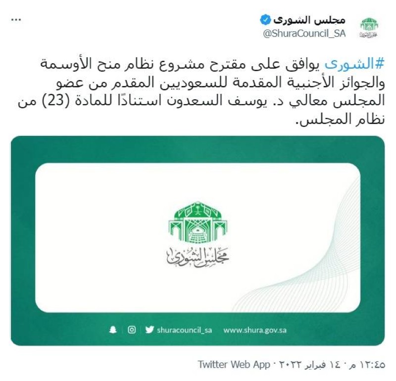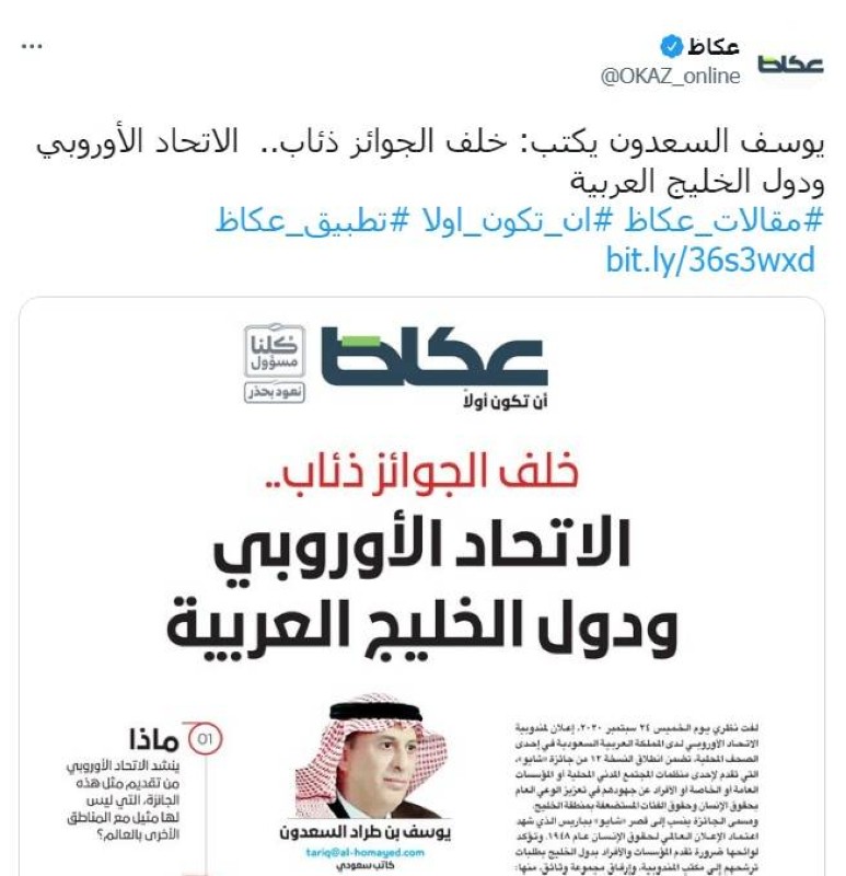 وسبق لعضو مجلس الشورى، الكاتب في «عكاظ» الدكتور يوسف السعدون أن أشار في مقالة نشرت في الصحيفة في سبتمبر 2020 تحت عنوان (خلف الجوائز ذئاب.. الاتحاد الأوروبي ودول الخليج العربية) واعتبر ما طرحه محفّزاً لطرح مشروع النظام، وتضمن المقال نقداً لإعلان مندوبية الاتحاد الأوروبي لدى المملكة، إطلاق النسخة 12 من جائزة «شايو»، التي تقدم لإحدى منظمات المجتمع المدني المحلية أو المؤسسات العامة أو الخاصة أو الأفراد عن جهودهم في تعزيز الوعي العام بحقوق الإنسان وحقوق الفئات المستضعفة بمنطقة الخليج.