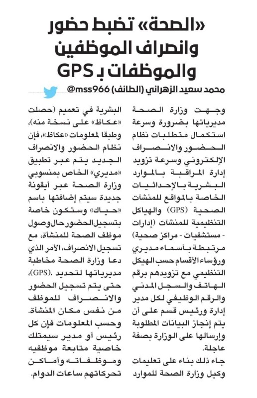 عن «GPS» الموظفين.. «الصحة» لـ «عكاظ»: تحت التقييم ولا يخترق الخصوصيات