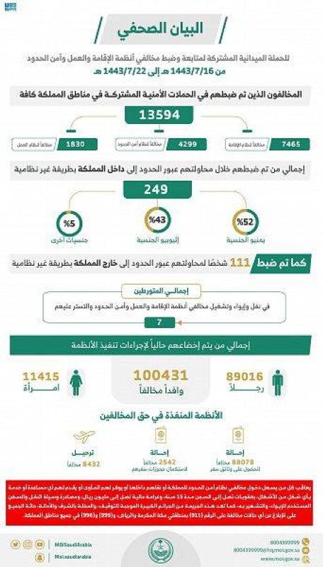 كما بلغ إجمالي من يتم إخضاعهم حاليًا لإجراءات تنفيذ الأنظمة 100,431 وافداً مخالفًا، منهم 89,016 رجلاً، و11,415 امرأة، وتمت إحالة 88,078 مخالفًا لبعثاتهم الدبلوماسية للحصول على وثائق سفر، وإحالة 2542 مخالفًا لاستكمال حجوزات سفرهم، وترحيل 8432 مخالفًا.