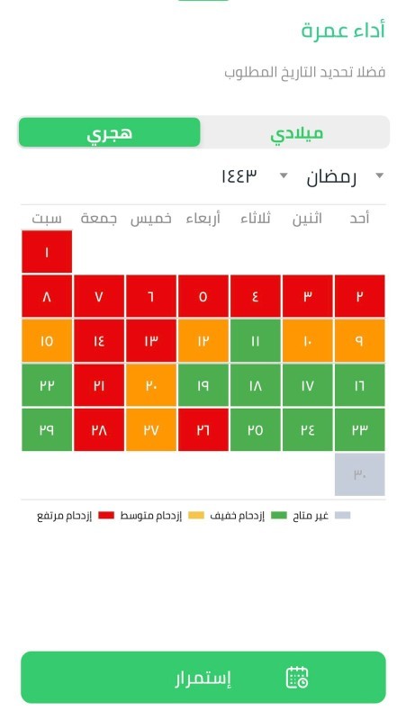 وسجلت بقية الأيام ازدحامًا خفيفًا ومتوسطًا باللونين الأخضر والأصفر، ما يعني وجود إمكانية للحجز.