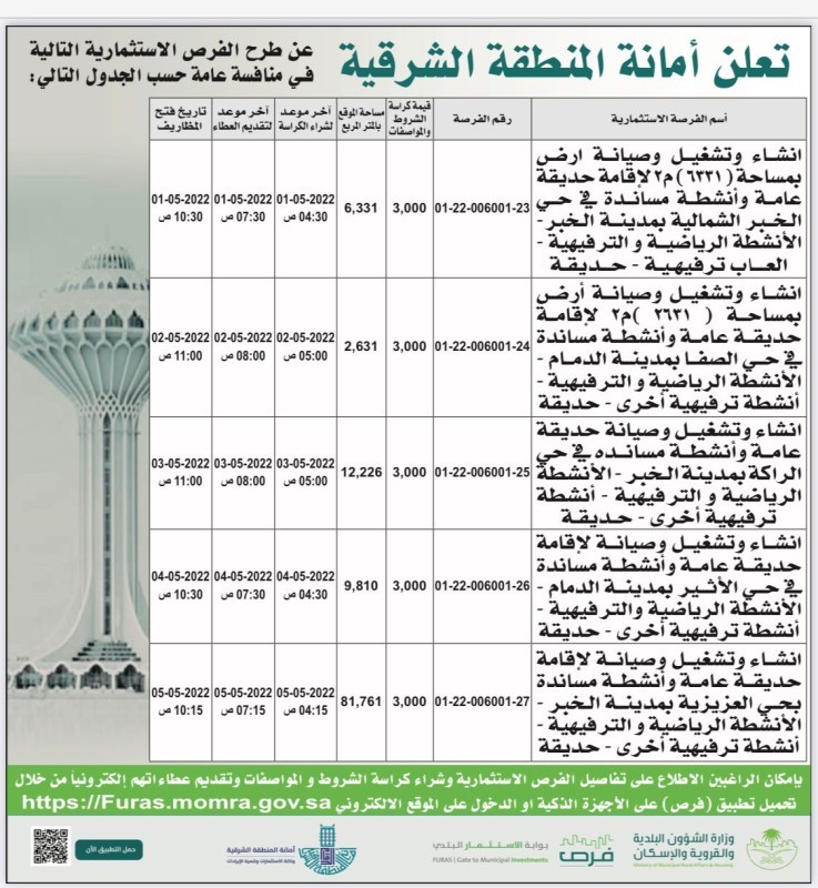 طرحت أمانة المنطقة الشرقية 4 مواقع استثمارية للحدائق العامة والخدمات المساندة، بإجمالي مساحة أكثر من 100 ألف متر مربع ومدة عقود استثمارية 25 سنة قابلة للتمديد، لدعم مبادرة السعودية الخضراء، ولخدمة أهالي المنطقة والارتقاء بالخدمات البيئية، وزيادة الرقعة الخضراء مما يعزز من عناصر جودة الحياة وتحقيق مفهوم كفاءة الإنفاق والاستدامة المالية.
