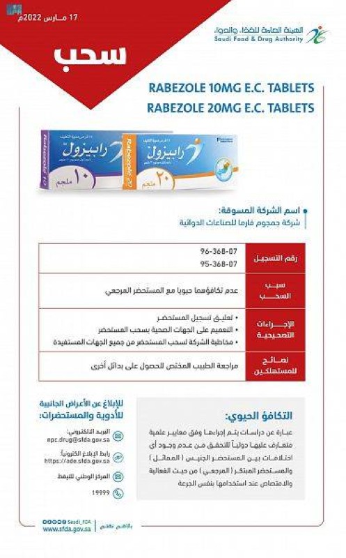 أصدرت الهيئة العامة للغذاء والدواء قراراً بتعليق تسجيل وسحب مستحضر«RABEZOLE» تركيز 20 ملغ و10 ملغ والمسجلة بالهيئة برقمي (95-368-07)(96-368-07) ويتم تسويقهما من قبل شركة جمجوم فارما للصناعات الدوائية، وذلك لعدم تكافئهما حيوياً مع المستحضر المرجعي، وبناءً على تعميم الهيئة على قرار لجنة تسجيل شركات ومصانع الأدوية ومنتجاتها بالهيئة رقم (23/1107/sfda/43) القاضي بتعليق تسجيل وسحب المستحضر.