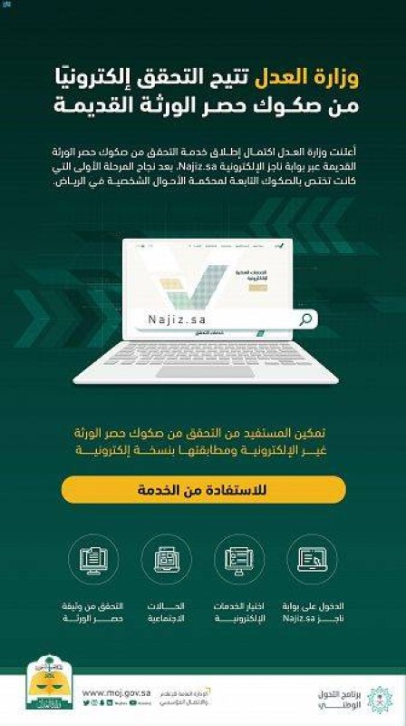 أعلنت وزارة العدل اكتمال إطلاق خدمة التحقق من صكوك حصر الورثة القديمة عبر بوابة ناجز الإلكترونية Najiz.sa، بعد نجاح المرحلة الأولى التي كانت تختص بالصكوك التابعة لمحكمة الأحوال الشخصية بالرياض.