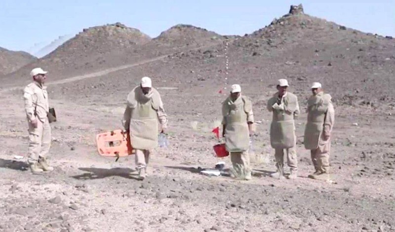 أفراد من فريق مشروع «مسام» يباشرون تطهير الأراضي اليمنية من الألغام. (واس)