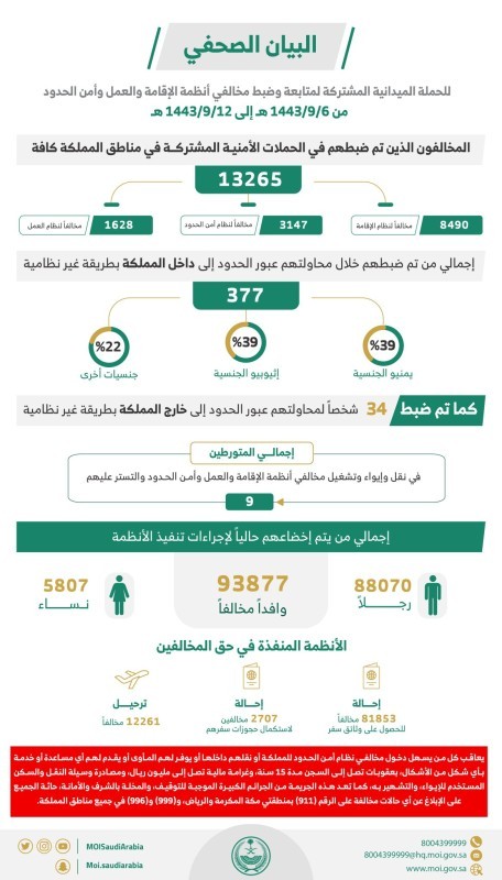 أسفرت الحملات الميدانية المشتركة لمتابعة وضبط مخالفي أنظمة الإقامة والعمل وأمن الحدود، التي تمت في مناطق المملكة كافة، وذلك للفترة من 6 / 9 / 1443 هـ الموافق 7 / 4 / 2022 م حتى 12 / 9 / 1443هـ الموافق 13 / 4 / 2022 م، عن النتائج التالية: