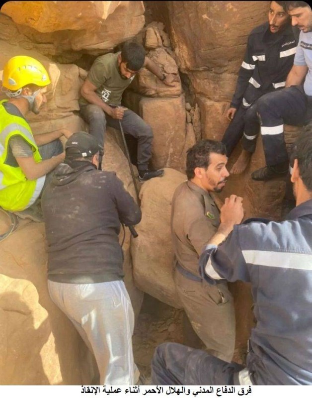 وأوضح الدفاع المدني لـ«عكاظ» أن فرق الإنقاذ منذ مباشرة الحالة قدمت المستلزمات اللازمة من توفير الماء والأكسجين والغذاء حتى أسفرت المحاولات عن إنقاذه بعد إزالة الصخور التي منعت الوصول إليه، بمشاركة فرق طبية من هيئة الهلال الأحمر في الموقع لمتابعة حالته الصحية، وفرق متخصصة من مدينة تبوك ومحافظة الوجه وطائرة مساندة من قاعدة الملك فيصل الجوية بالقطاع الشمالي.