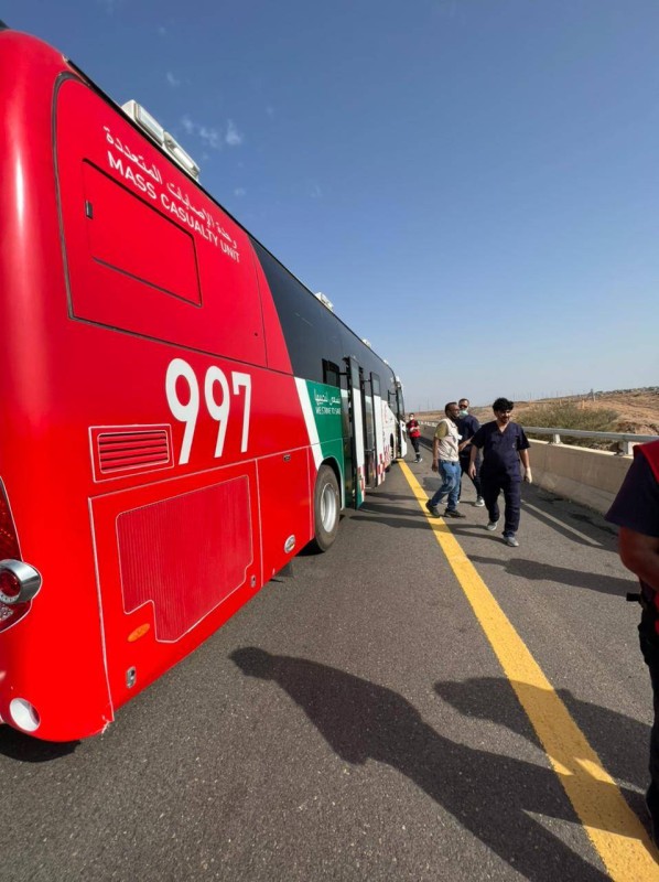 وتواجدت الفرق الإسعافية في الموقع لحين إنهاء أعمال الدفاع المدني في إخراج المحتجزين من الباص وتم نقل جميع الحالات المتوفاة عن طريق النقل غير الإسعافي التابع للهيئة.
