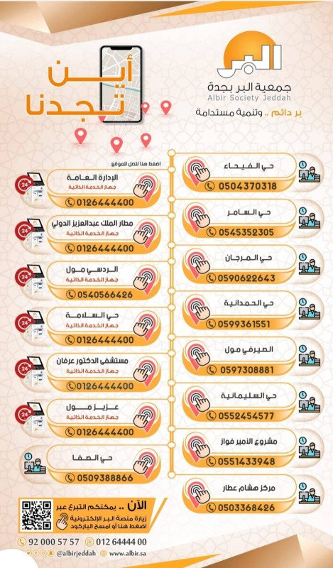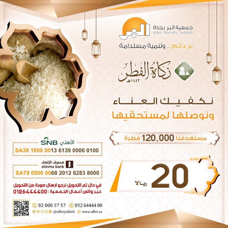 تستعد جمعية البر بجدة لاستقبال زكاة الفطر إلكترونياً في مقرها الرئيس بحي الزهراء ومكاتبها الفرعية المنتشرة في عدد من الأحياء، إضافة الى مركز هشام عطار للغسيل الكلوي التابع للجمعية، كما يتم استقبال الزكاة عبر أجهزة الخدمة الذاتية المنتشرة في أسواق الرد سي مول والصيرفي مول وعزيز مول ومطار الملك عبدالعزيز الدولي. إضافة الى استقبال الزكاة من خلال منصة البر الإلكترونية، وتطبيق الجمعية في الهواتف الذكية.