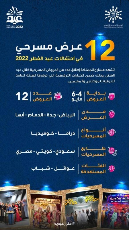 تنتعش المسارح السعودية مجددًا باحتفالات الهيئة العامة للترفيه بمناسبة عيد الفطر ضمن «برنامج احتفالات العيد 2022»، حيث تنظم الهيئة في أيام العيد 4 مسرحيات بـ12 عرضًا ضمن مجموعة خيارات ترفيهية متنوعة توفرها للمواطنين والمقيمين والزائرين للاحتفال بالمناسبة.