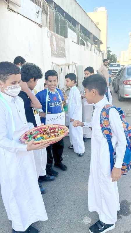 وتبادل منسوبو ومنسوبات المدارس من المعلمين والمعلمات والطلاب والطالبات التهنئة بالعيد، علاوة على إقامة حفلات معايدة مصغرة في المدارس بحضور الجميع.