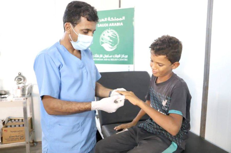 طبيب في عيادات مركز الجعدة الصحي يداوي جراح طفل يمني. (واس)