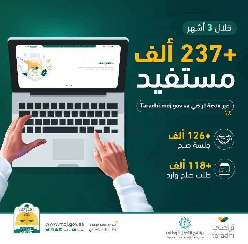 وأوضحت الوزارة أن منصة «تراضي» تتيح حل النزاعات «عن بعد» دون حاجة أطراف النزاع لمراجعة مكاتب المصالحة، بهدف التيسير على المستفيدين وسهولة الحصول على الخدمة، مبينة أن عدد طلبات الصلح التي استقبلتها المنصة خلال الربع الثالث من العام الهجري 1443، بلغ أكثر من 118 ألف طلب.