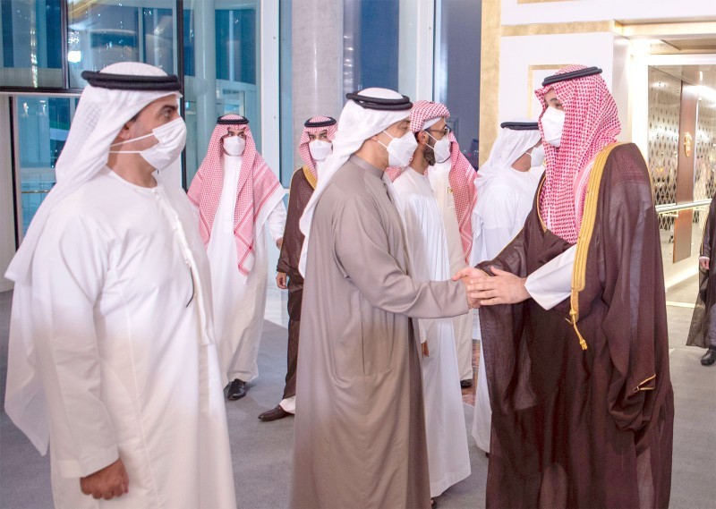 وكان في استقبال ولي العهد، بمطار الرئاسة في أبوظبي، رئيس دولة الإمارات العربية المتحدة الشيخ محمد بن زايد آل نهيان، الذي أعرب عن جزيل شكره وتقديره لولي العهد على ما أبداه من مشاعر أخوية صادقة تجاه دولة الإمارات وشعبها في مصابهم.