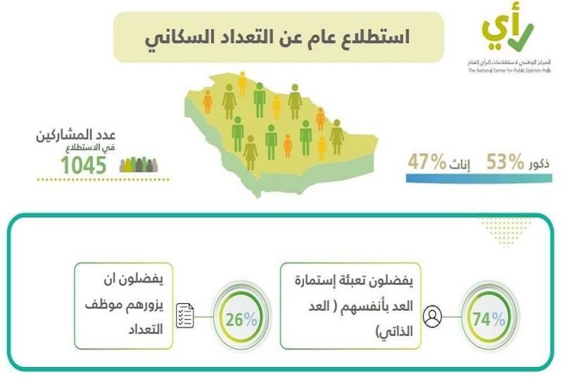 وكشفت نتائج الاستطلاع أن 74% يفضلون تعبئة استمارة «العد الذاتي» بأنفسهم، فيما أن 26% يفضلون أن يزورهم موظف التعداد.
