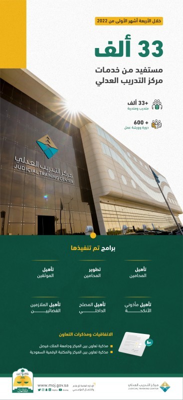كشفت وزارة العدل أن عدد المتدربين والمتدربات الذين استفادوا من البرامج التدريبية التأهيلية والتطويرية في مركز التدريب العدلي خلال الأشهر الأربعة الأولى من عام 2022 بلغ 33182 متدربًا ومتدربة، كما نفذ المركز نحو 640 دورة وورشة.