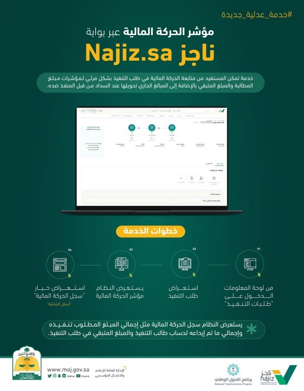 مكّنت وزارة العدل عموم المستفيدين من متابعة الحركة المالية لطلبات التنفيذ بشكل إلكتروني عبر بوابة ناجز للخدمات العدلية Najiz.sa، بحيث تستعرض لهم الحركة المالية عبر مؤشرات تبين مبالغ المطالبات والمبالغ المتبقية بالإضافة إلى المبالغ الجاري تحويلها في حال تم السداد من قبل المنفذ ضده.