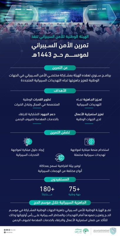 واشتمل التمرين على مجموعة من الأنشطة الفنية والإدارية الرامية إلى تطوير قدرات الجهات الوطنية المشاركة في موسم الحج وتعزيز صمودها اتجاه التهديدات السيبرانية المتجددة، ورفع جاهزيتها للتعامل مع الحوادث السيبرانية، بما يسهم في دعم الجهات الوطنية والبنى التحتية الحساسة وحماية المصالح الحيوية للمملكة باتباع الممارسات الآمنة للتعامل مع التقنية.