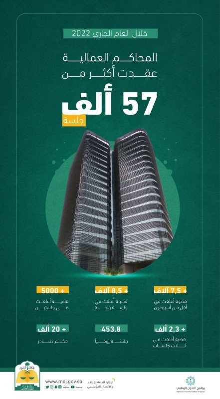 كشفت وزارة العدل انعقاد أكثر من 57 ألف جلسة عمالية في جميع المحاكم والدوائر العمالية على مستوى السعودية خلال الأشهر الخمسة الأولى من العام الحالي 2022، فيما بلغ إجمالي الأحكام الصادرة أكثر من 20 ألف حكم.