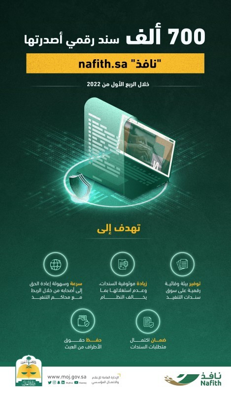 مكنّت منصة نافذ nafith.sa التابعة لوزارة العدل، مئات آلاف المستفيدين سواء أفراداً أو شركات، من إنشاء وحفظ وإدارة سندات التنفيذ إلكترونياً.