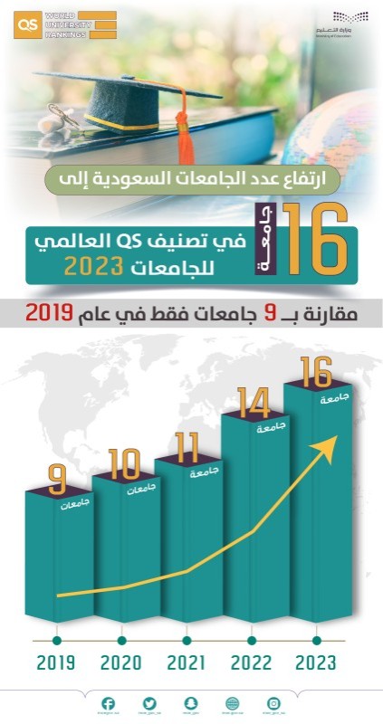 استمراراً لنجاحات تعليم السعودية عالمياً، قفز تصنيف الجامعات السعودية في مؤشر تصنيف QS للجامعات العالمية إلى 16 جامعة في العام 2023 بزيادة 7 جامعات على التصنيف الصادر للعام 2019، حيث كان عدد الجامعات السعودية آنذاك 9 جامعات.