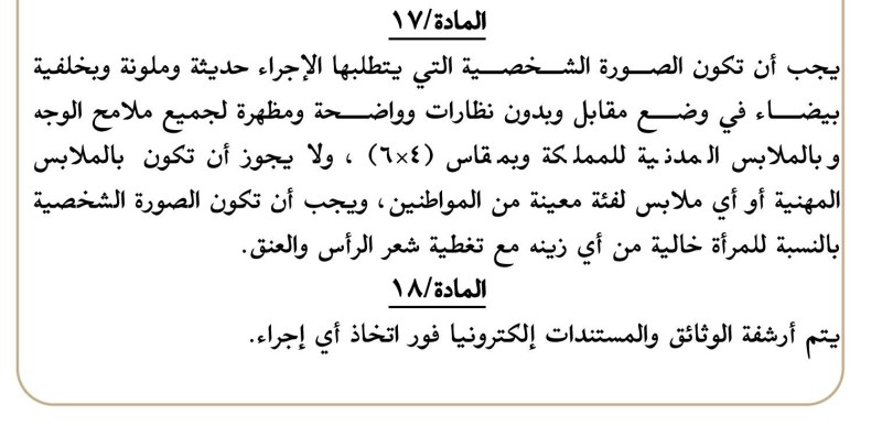 وكانت المادة «17» قبل تعديلها تنص على أنه: يجب أن تكون الصورة الشخصية التي يتطلبها الإجراء حديثة وملونة وبخلفية بيضاء في وضع مقابل ودون نظارات وواضحة ومظهرة لجميع ملامح الوجه وبالملابس المدنية للمملكة، وبمقاس (4×6)، ولا يجوز أن تكون بالملابس المهنية أو أي ملابس لفئة معينة من المواطنين، ويجب أن تكون الصورة الشخصية للمرأة خالية من أي زينة مع تغطية شعر الرأس والعنق.