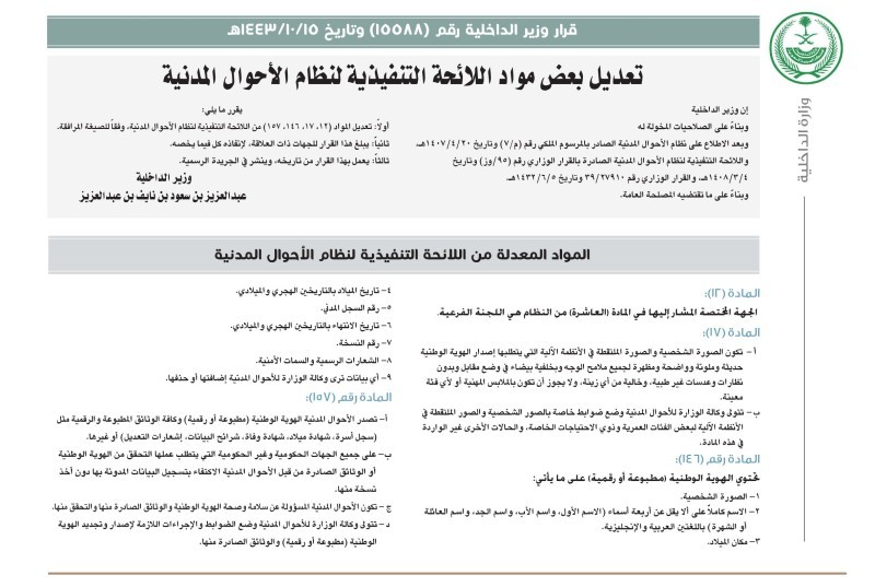 كشفت التعديلات الجديدة للمادة «17» من اللائحة التنفيذية لنظام الأحوال المدنية، التي نشرتها جريدة أم القرى الرسمية في عددها الصادر اليوم (الجمعة) 10 يونيو 2022، حذف العبارة التي تنص على ضرورة تغطية شعر الرأس والعنق بالنسبة للصورة الشخصية للمرأة في بطاقة الهوية الوطنية.