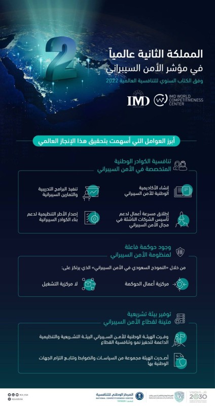 حققت المملكة العربية السعودية المرتبة الثانية عالمياً في مؤشر الأمن السيبراني وذلك ضمن تقرير الكتاب السنوي للتنافسية العالمية لعام 2022 الصادر عن مركز التنافسية العالمي التابع للمعهد الدولي للتنمية الإدارية في سويسرا IMD، الذي يُعد واحداً من أكثر التقارير شمولية في العالم، ويهدف إلى تحليل وترتيب قدرة الدول على إيجاد بيئة داعمة ومحفزة للتنافسية والمحافظة عليها وتطويرها.