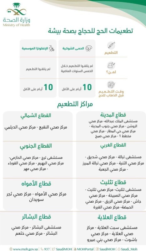 اعتمدت صحة بيشة مستشفيات الملك عبدالله، تبالة، تثليث، ترج، البشائر، سبت العلاية إضافة إلى ٢٨ مركزاً صحياً في قطاعات قطاع المدينة، القطاع الغربي، القطاع الشمالي، القطاع الجنوبي، تثليث، الأمواه، العلاية، البشائر لاستقبال الراغبين في الحج لهذا العام ١٤٤٣هـ وإعطائهم التطعيمات اللازمة للحمّى الشوكية والإنفلونزا الموسمية وفق التعليمات المحددة صحياً.