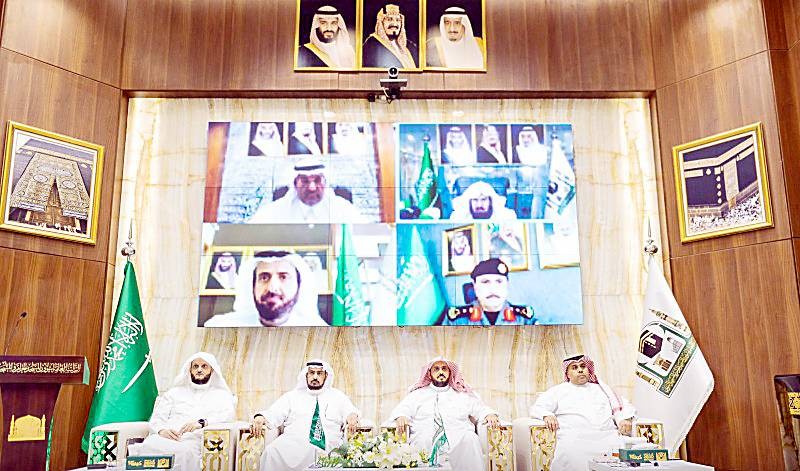 رئيس رئاسة شؤون الحرمين ووزير الحج ومدير الأمن العام خلال اللقاء الإعلامي أمس.