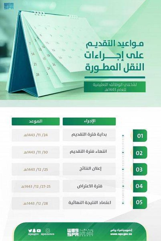 وتتيح الوزارة التقديم على إجراءات النقل من خلال نظام نور اعتباراً من يوم الخميس 24/ 11/ 1443، على أن تستمر فترة التقديم حتى تاريخ 30/ 11/ 1443، وصولاً إلى الإعلان عن نتيجة إجراءات النقل الخارجي الأحد 25/ 12/ 1443، وفق عمليات مطوّرة تحقّق العديد من المزايا والمرونة والموضوعية في التعامل مع المتطلبات الجديدة لاستثمار الكوادر التعليمية.