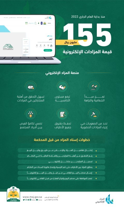 نفذت وزارة العدل عبر منصة المزاد الإلكتروني 43 مزاداً عقارياً، منذ بداية العام الحالي 2022، فيما بلغت قيمة المزادات نحو 155 مليون ريال، في عدة مناطق.