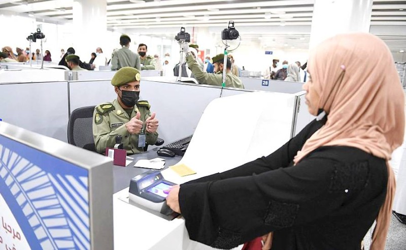 حاجة تنهي إجراءات دخولها بمطار الأمير محمد بن عبدالعزيز بالمدينة. (واس)