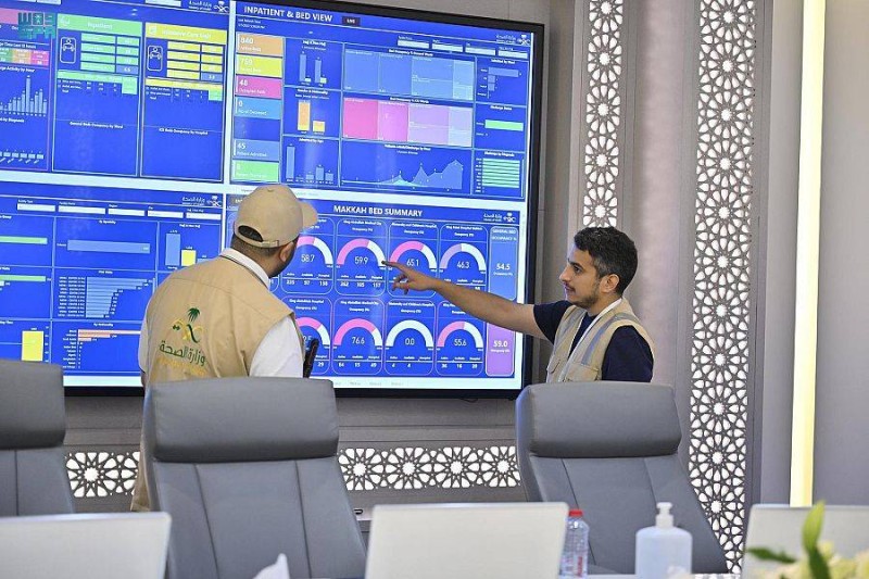 وبين الدكتور هاني جوخدار أن غرفة القيادة والتحكم في وزارة الصحة تستطيع من خلالها مراقبة كافة الأعمال في جميع المنشئات الصحية، والتعامل مع أنظمة المستشفيات والمراكز الصحية بمنطقة المشاعر والعاصمة المقدسة والمدينة المنورة وجدة والطائف والباحة، واتخاذ قرارات إعادة توزيع المنومين تكتيكياً أو حسب الحاجة المرضية بداية من الأسرة الشاغرة والمؤشرات الصحية، توزيع الحالات المرضية في منطقة المشاعر، ونهايةً بكافة الإمدادات التي تصل إلى المرضى كالفحوصات والدواء وغيرها، حيث تعد غرفة التحكم مركزاً لرصد مؤشرات الحالة الصحية والإنذار المبكر والتوجيه والمتابعة للقرارات الصحية من خلال شبكة معلومات واتصالات متقدمة وتحليل للبيانات على مدار الساعة بكوادر سعودية مؤهلة، حيث تضم غرفة التحكم شاشات متعددة ومختلفة الأعمال تعمل لتوضيح حالات المستشفيات، ومواقع تنقلات سيارات الإسعاف، ومهابط الإخلاء الطبي ومراقبة ومتابعة منصات ومؤشرات مختلفة.وأضاف أن هذا العام أضافة وزارة الصحة برنامج الطب الافتراضي وهي عبارة عن عيادات (افتراضية) تقدم الخدمات للمرضى من حجاج بيت الله الحرام، بهدف الدعم بأطباء في مناطق أخرى خارج مكة المكرمة.وبين وكيل وزارة الصحة للصحة العامة أنه من خلال غرفة التحكم يمكننا الاطلاع على أعمال غرف الطوارئ في المنشئات الصحية ومعرفة أعداد المرضى في الطوارئ وقياس سرعة تقديم الخدمة، لعمل توازن وتحقيق انسيابية في الحركة، لخفض التكدس، وهذه من أهم المؤشرات التي يتم مراقبتها لدينا في غرفة التحكم، بالإضافة إلى مراقبة غرف العنايات المركزة، ومتابعة العيادات الخارجية، ومراكز الرعاية الأولية، ومدى سرعة تدفق المرضى إليها، والإمدادات الموجودة داخل هذه العيادات.