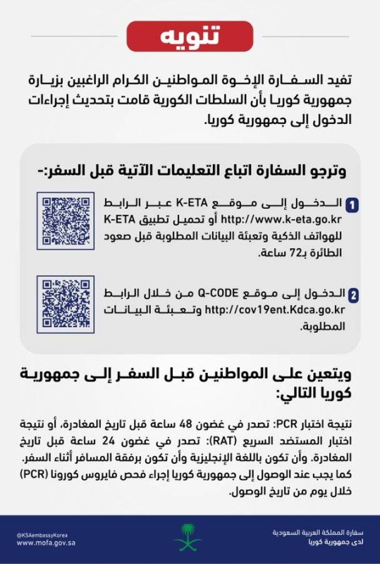 وأشارت السفارة في تغريدتها إلى أن جمهورية كوريا الجنوبية قامت بتحديث إجراءات الدخول إليها، وأن على الراغبين في السفر الدخول إلى موقع K-ETA عبر الرابط http://www.k-eta.go.kr أو تحميل تطبيق K-ETA للهواتف الذكية وتعبئة البيانات المطلوبة قبل صعود الطائرة بـ72 ساعة، ثم الدخول إلى موقع Q-CODE من خلال الرابط http://cov19ent.Kdca.go.kr وتعبئة البيانات المطلوبة.